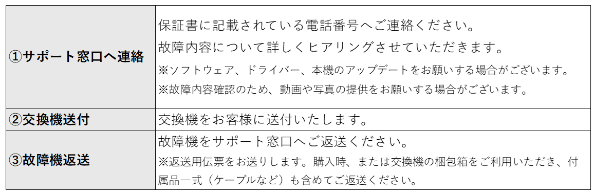 7. 製品交換が必要な場合、在庫状況などにより、同型番品がご用意出来ない際は、同等機能の代品をもって対応させていただく場合がございます。