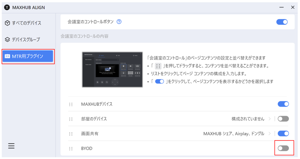 2. MAXHUB Alignの[MTR用プラグイン]を選択し[BYOD]をオンにしてください。