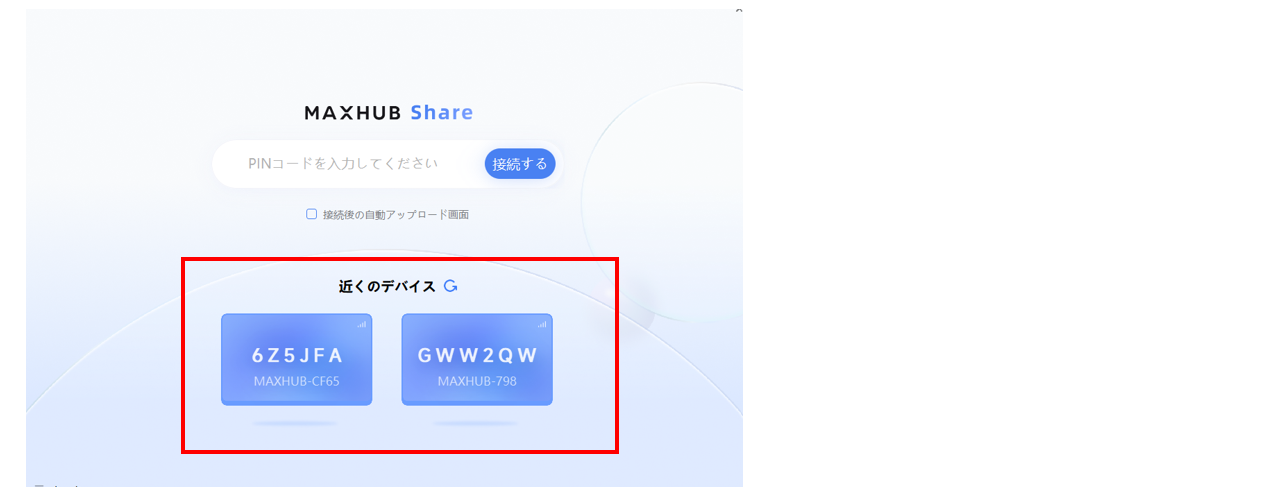 2. MAXHUB Shareを起動すると、「Nearby device」にPC付近で検索されたMAXHUB製品が表示される