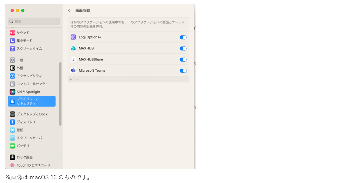 Mac OSの場合 インストール後、「プライバシーとセキュリティ」の「画面収録」より、「MAXHUB Share」アプリの許可設定が必要です