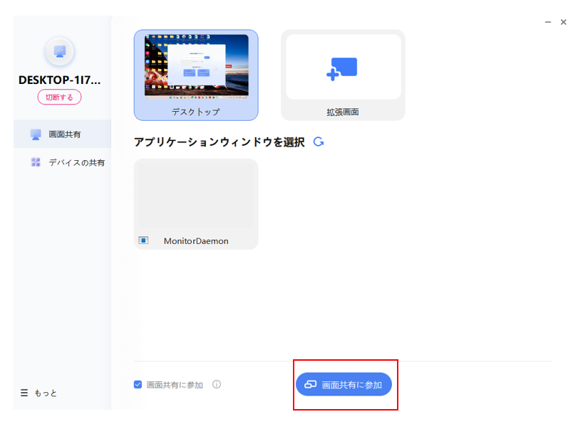 本機との接続後、「画面共有に参加」を選択すると画面投影が開始されます。