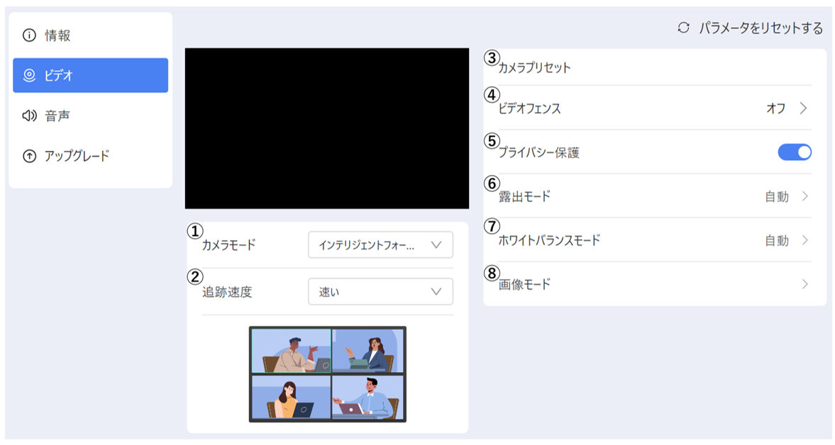 ②追跡速度:カメラの追跡速度を変更できます。手動フレーミング、スマートギャラリーモードでは使用できません。