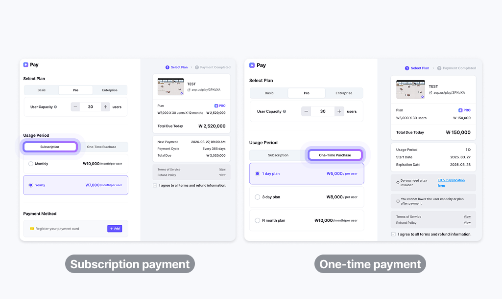 Please select a payment plan, user capacity, usage period, and payment method, then press the payment button.