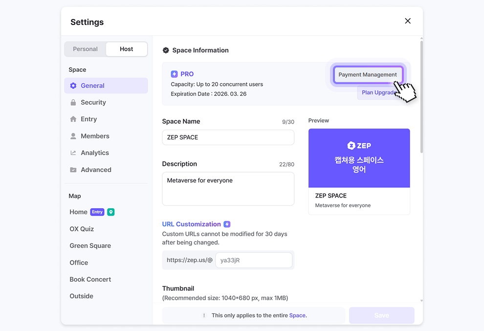 Go to the settings of the space you want to upgrade, then navigate to [General] tab and click the [Plan Upgrade] button.