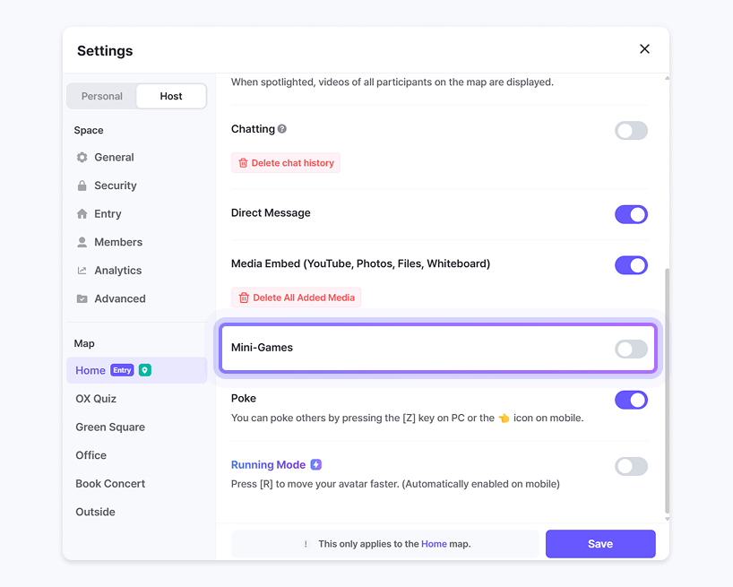Only users with Staff, Admin, or Owner permissions will be able to start mini-games if you select Disallow guest embedding in Map Settings.