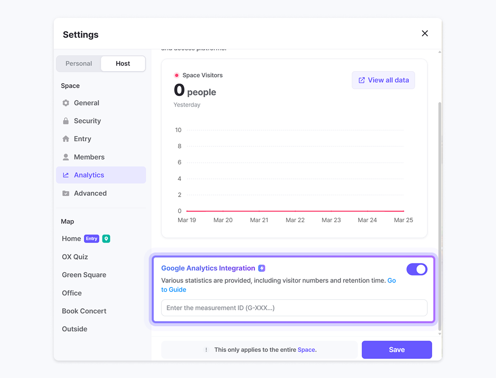 Go to your Space and open the Settings window. Click on the "Advanced" tab under Space Settings. Find the Google Analytics Intergration section and paste the measurement ID that you copied earlier from Google Analytics. Click "Save" to apply the changes.