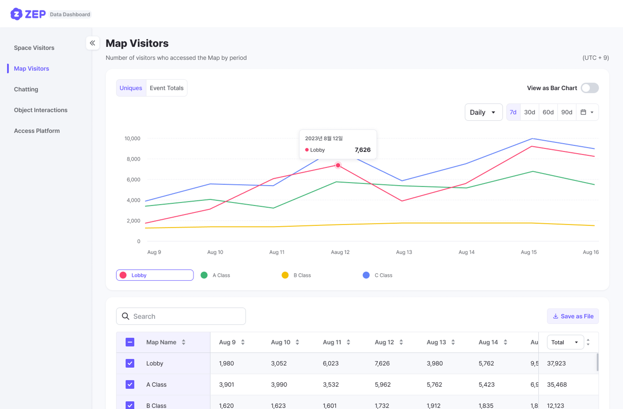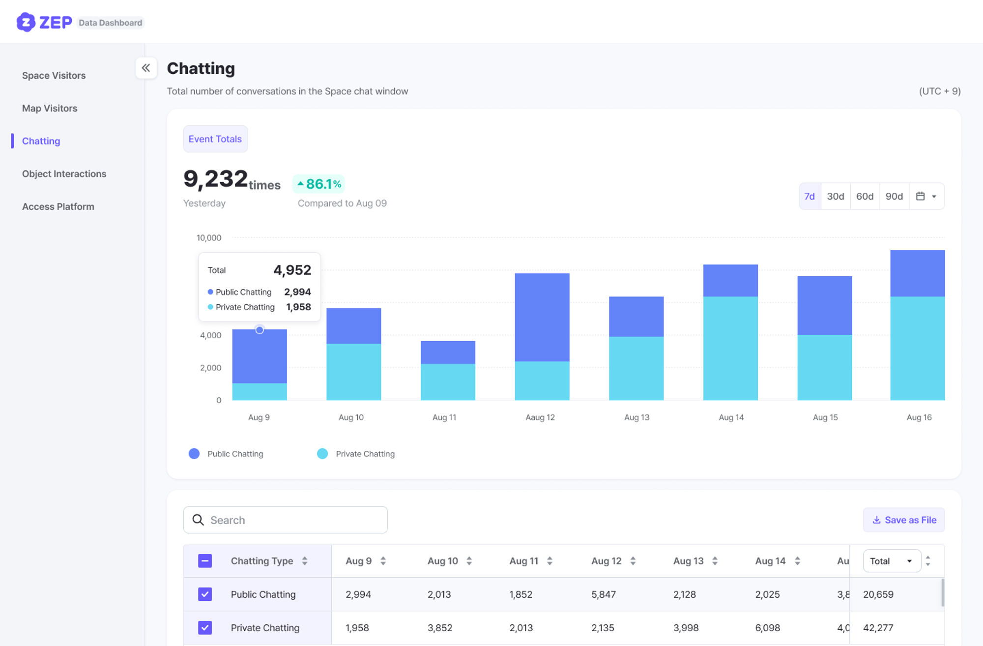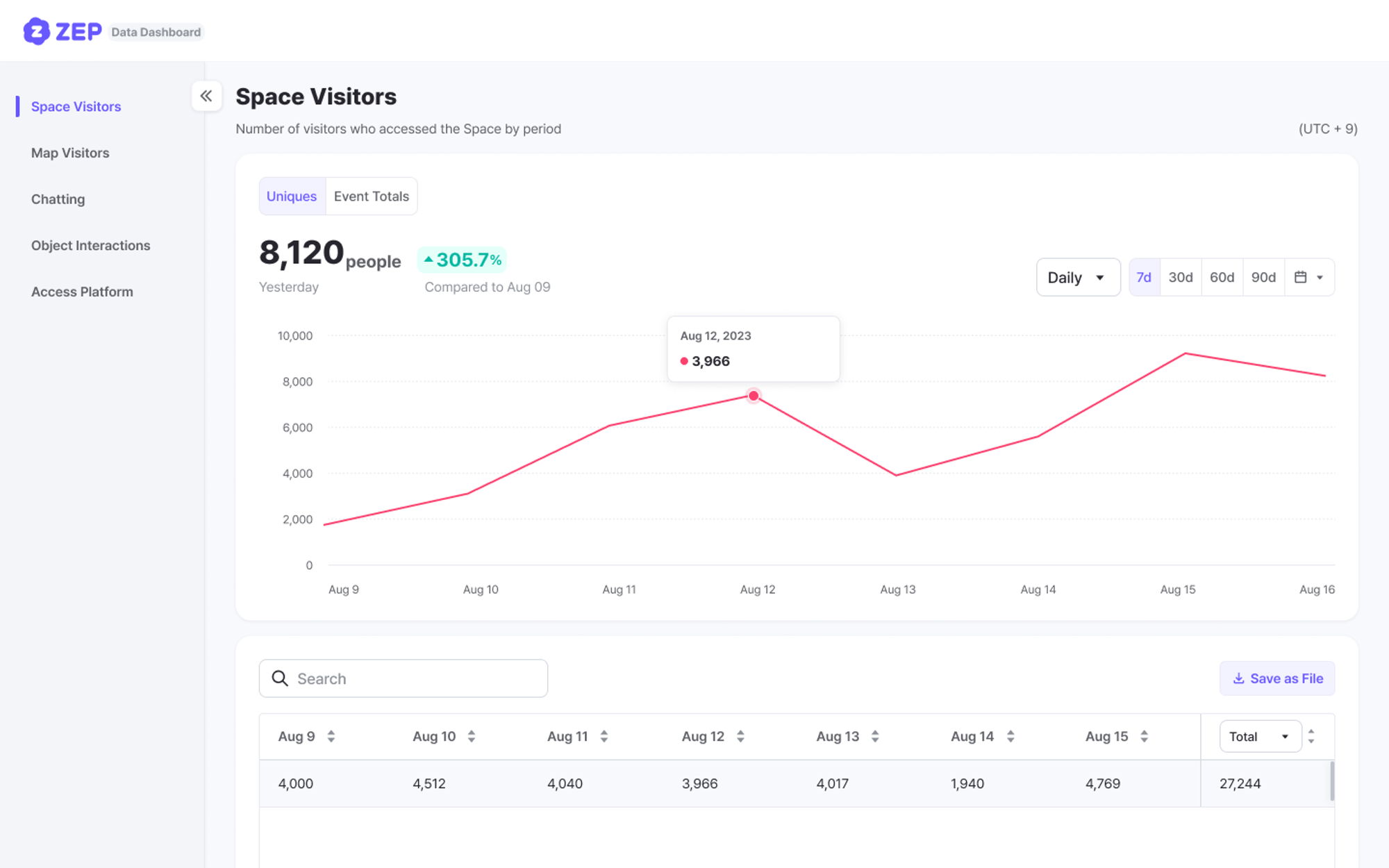 Data dashboard is a feature provided in the Pro plan and enables users to see detailed information about their Space. Space visitors / visitors per map / chat count / object interactions / access platform data is provided.