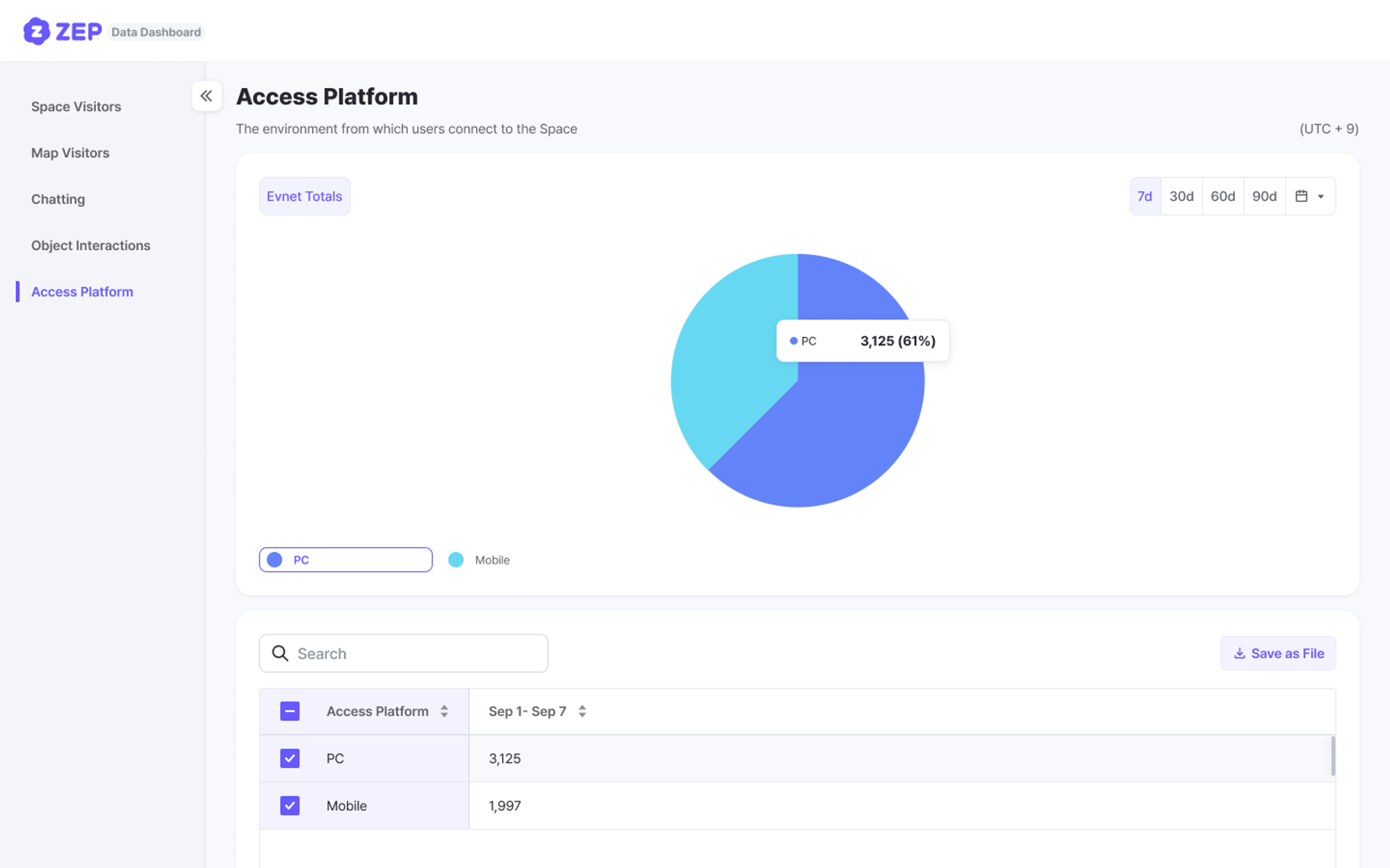 The environment from which users connect to the Space. You can see which environments were accessed the most, PC(web) or mobile devices (web/ app).