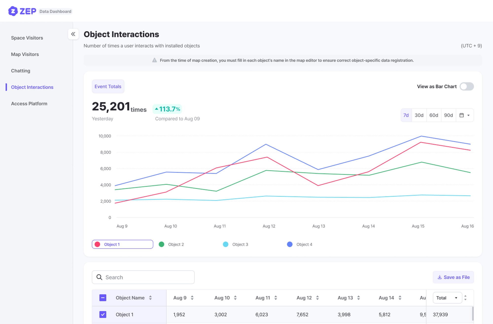 In Spaces utilizing the Pro Plan, all data is collected in real-time to the server and is displayed in the ZEP Data Dashboard the next day. All the information provided on the ZEP Data Dashboard is officially available for use.