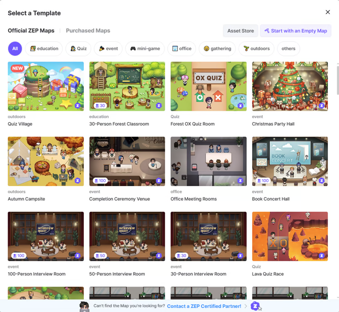 Choose one of 'School Quiz Room,' 'Space Quiz Room,' or 'Forest OX Quiz Room' by [Create Space] > [Choose Template]