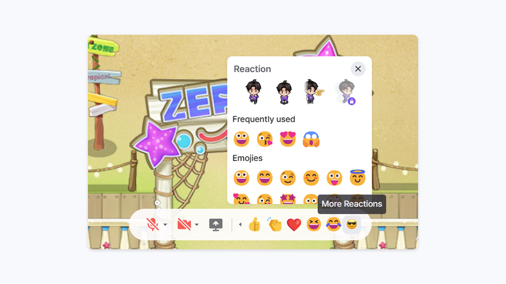 Reaction feature: Click the reaction icon to use the default icons, and click the 'More Reactions' button to freely use other emoticons in addition to the default actions.