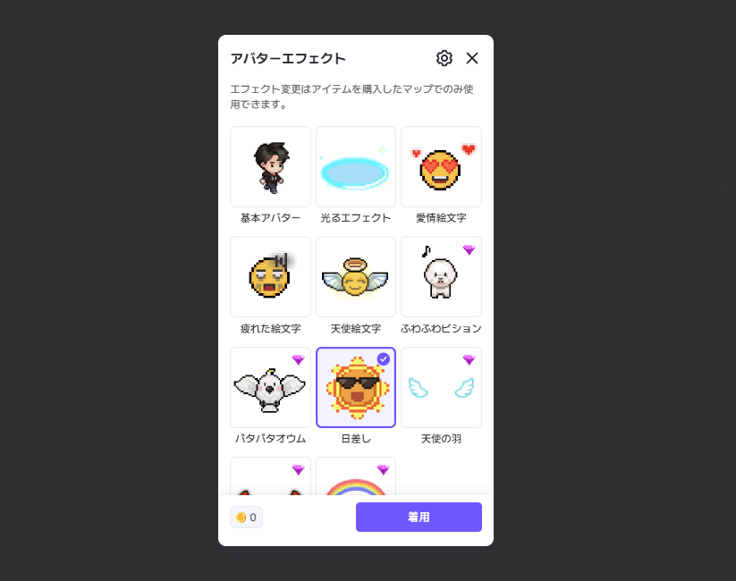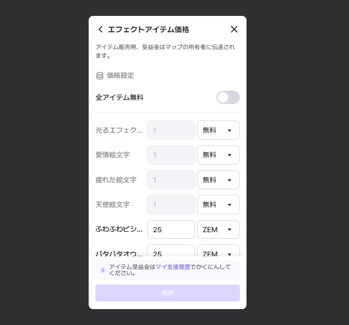 管理者は特殊効果アイテムの価格を「無料/非表示/ZEM/ポイント」に設定できます。
