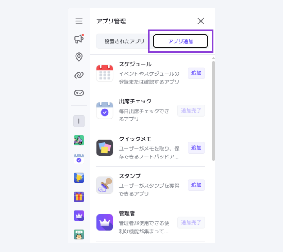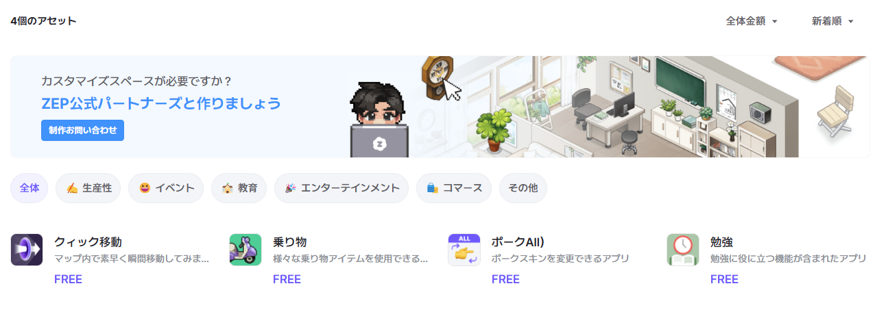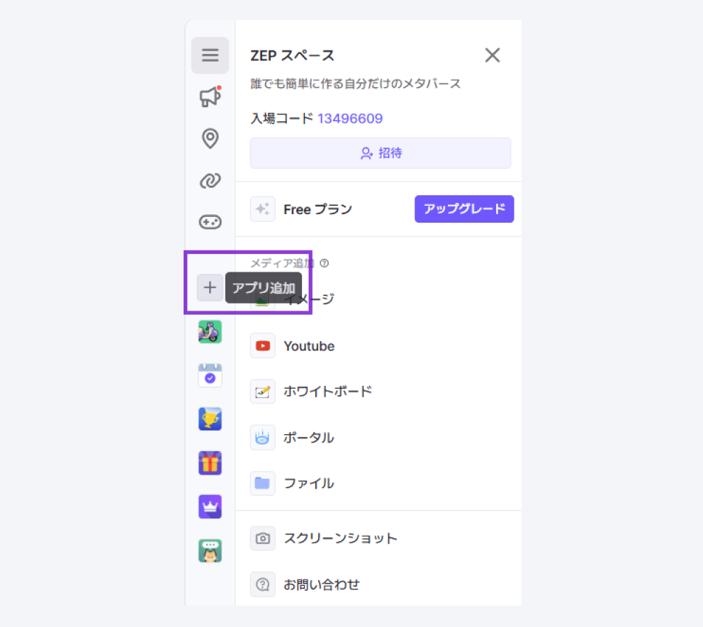 実行権限ZEPで管理者は自身が作ったマップに必要なアプリを事前設置できます。サイドバーでアプリ設置後、ユーザーは管理者が設置したアプリを使用できます。設置と削除はスペース所有者のみ可能となります。実行方法アプリを実行するには下記の手順をご参考ください。基本的に提供されるアプリ以外にZEP アセットストアで他クリエイターがアップロードしたアプリをダウンロードできます。2. サイドバーでアプリを追加できます。