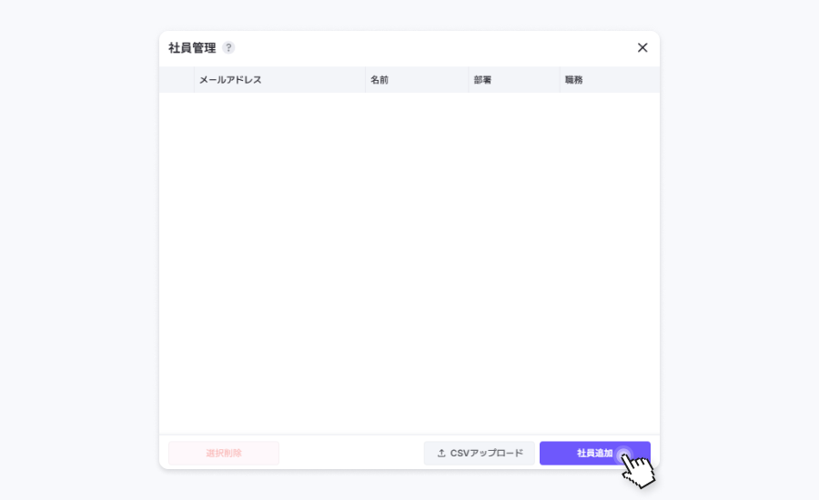 社員管理リストの[CSVアップロード]をクリックし、保存したCSVファイルを追加してください。