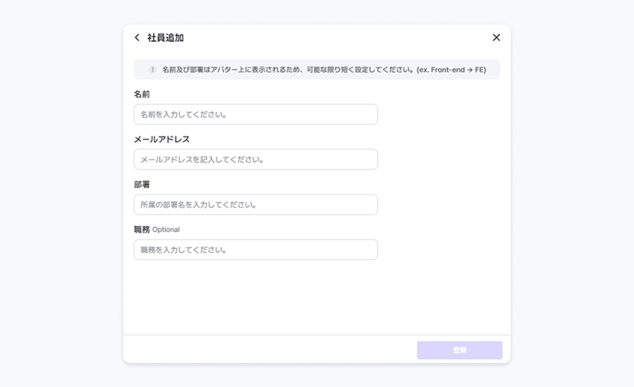 名前/メールアドレス/部署名を記入し、社員を登録しましょう。