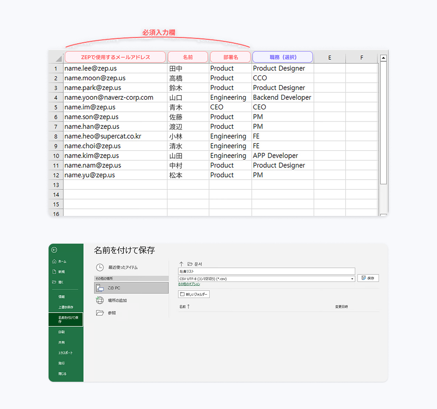ExcelまたはGoogleスプレッドシートにZEPで使用するメールアドレス/名前/部署名の順で記入してください。