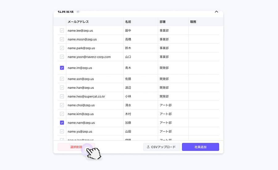 削除する社員を選択し、下段の[選択削除]をクリックし、削除してください。