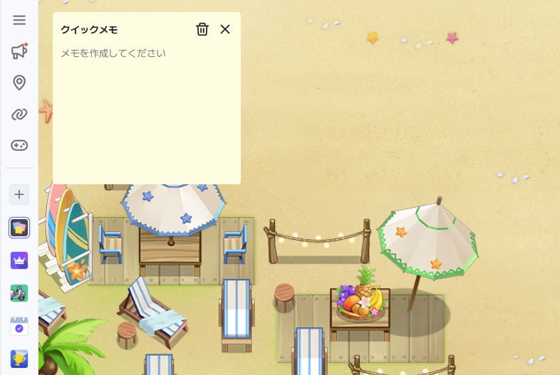 アプリ使用方法メモ帳はノートパッドで提供され、作成者のみ確認できます。テキストの入力や削除ができ、テキストはページを更新しても保存されます。メモはスペースごとに保存され、再接続時、いつでも確認及び作成できます。非ログインユーザーのメモは保存されません。