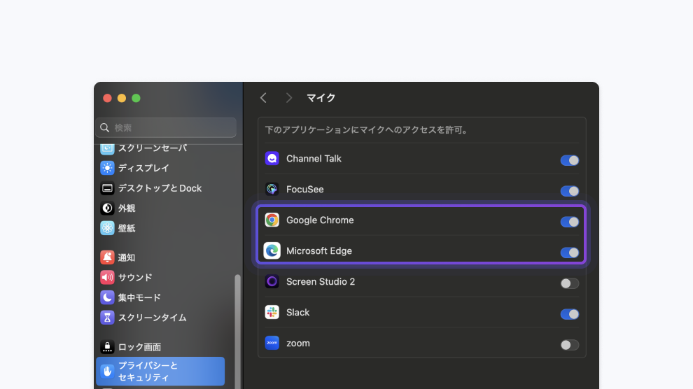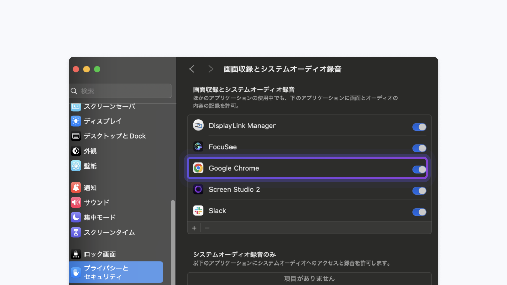 • Appleメニュー → システム設定 → プライバシーとセキュリティ → 画面とシステムのオーディオ録音 → Google Chromeを検索して許可する