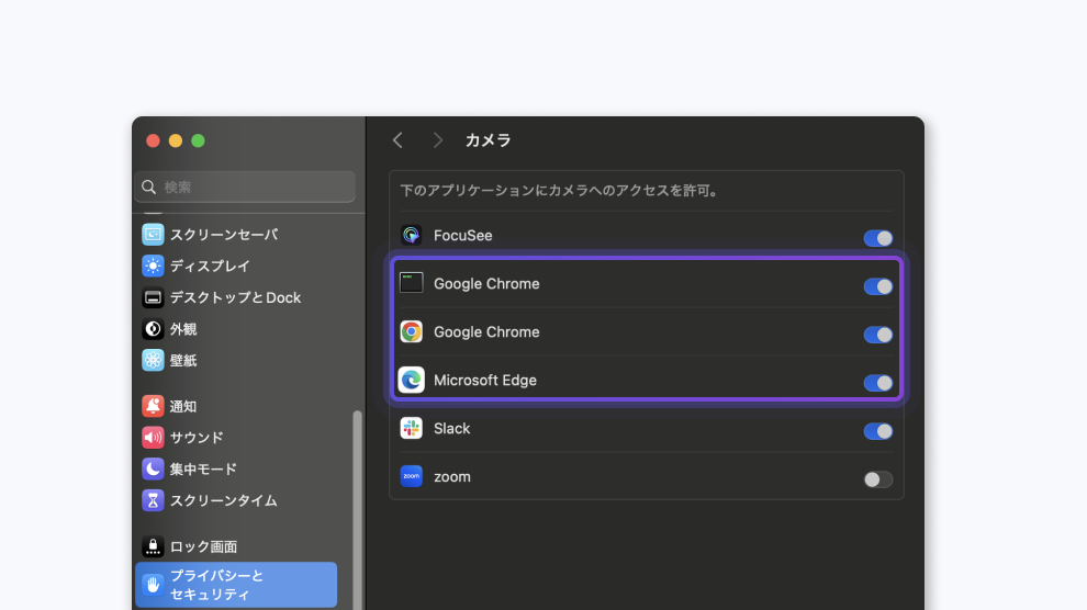 • Appleメニュー → システム設定 → プライバシーとセキュリティ → カメラ → Google Chromeを検索して許可する