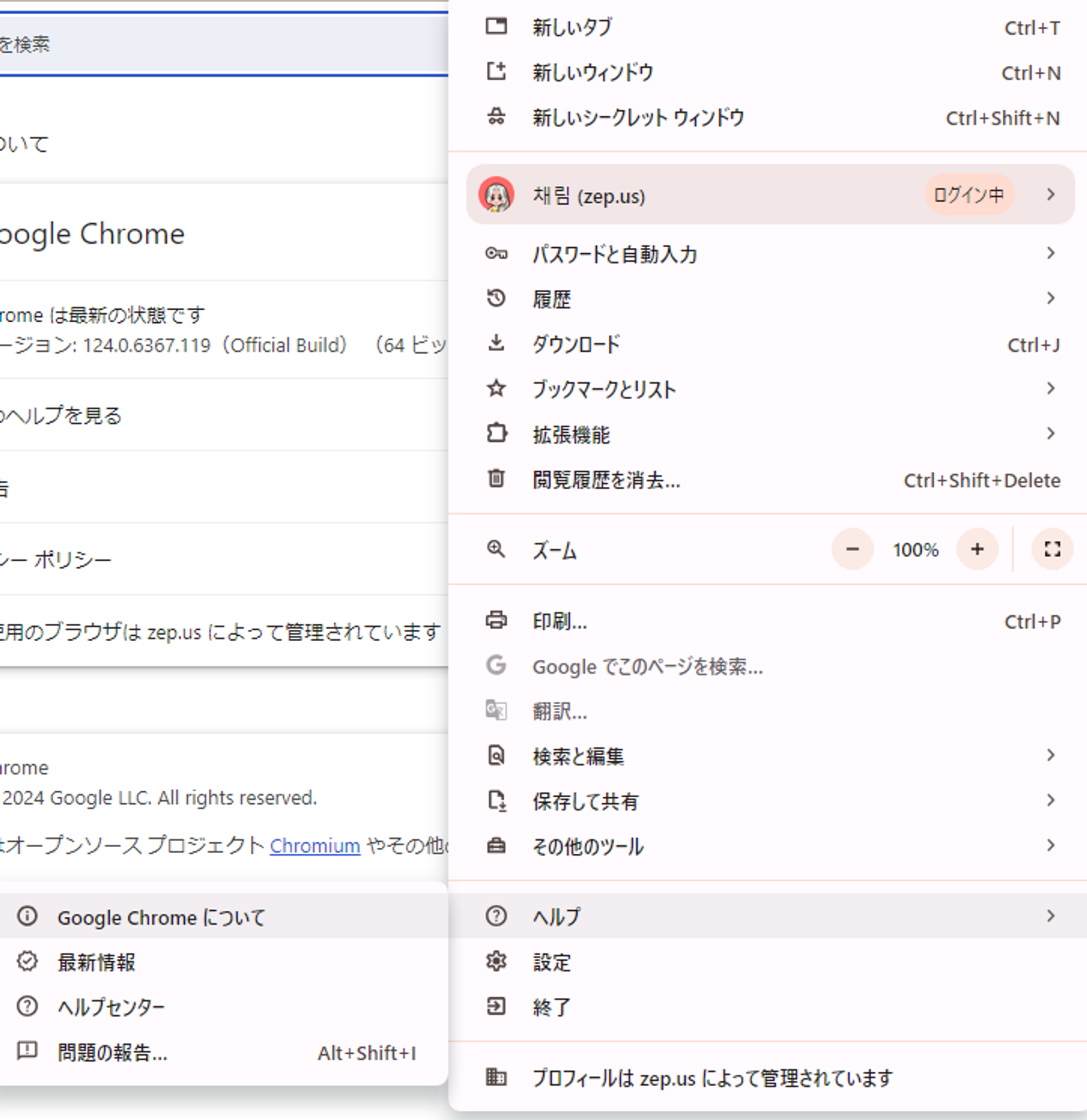 1. [chrome 右上の点3つ]→[ヘルプ]→[Google Chromeについて]