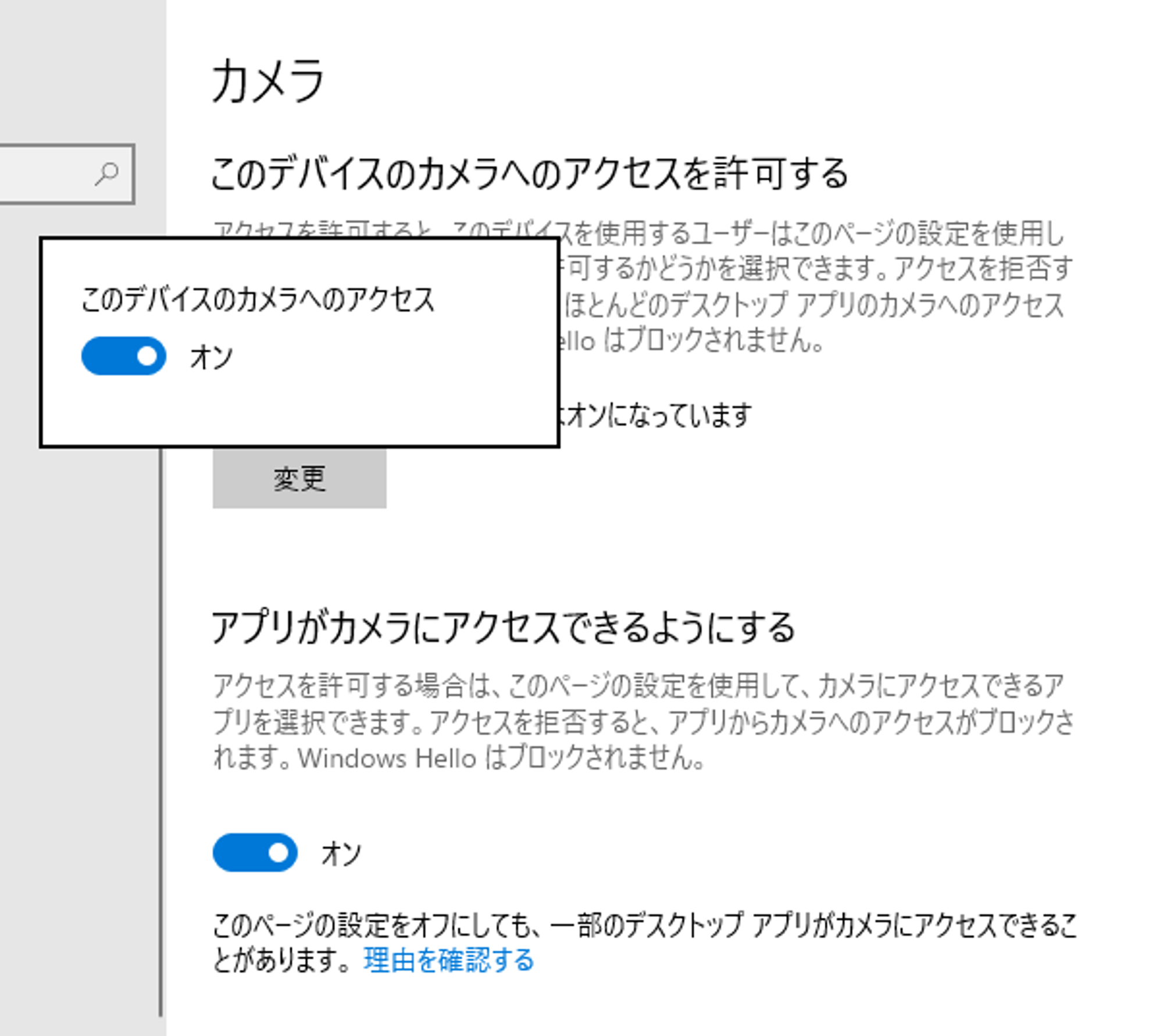 ウィンドウの検索窓で「カメラのプライバシー設定」を検索し、以下の内容を確認してください。