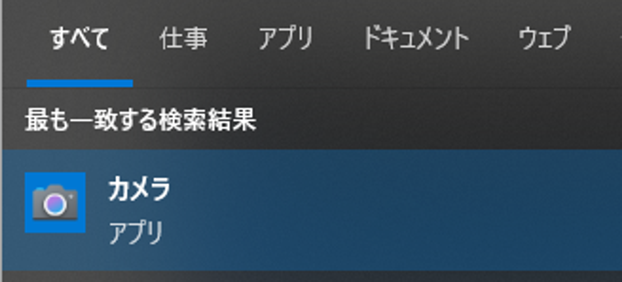 上記の内容をすべて確認したにも関わらず、カメラが動作しない場合は、Windowsの検索窓に「カメラ」と入力して検索し、カメラアプリが正常に動作するかどうか確認してください。