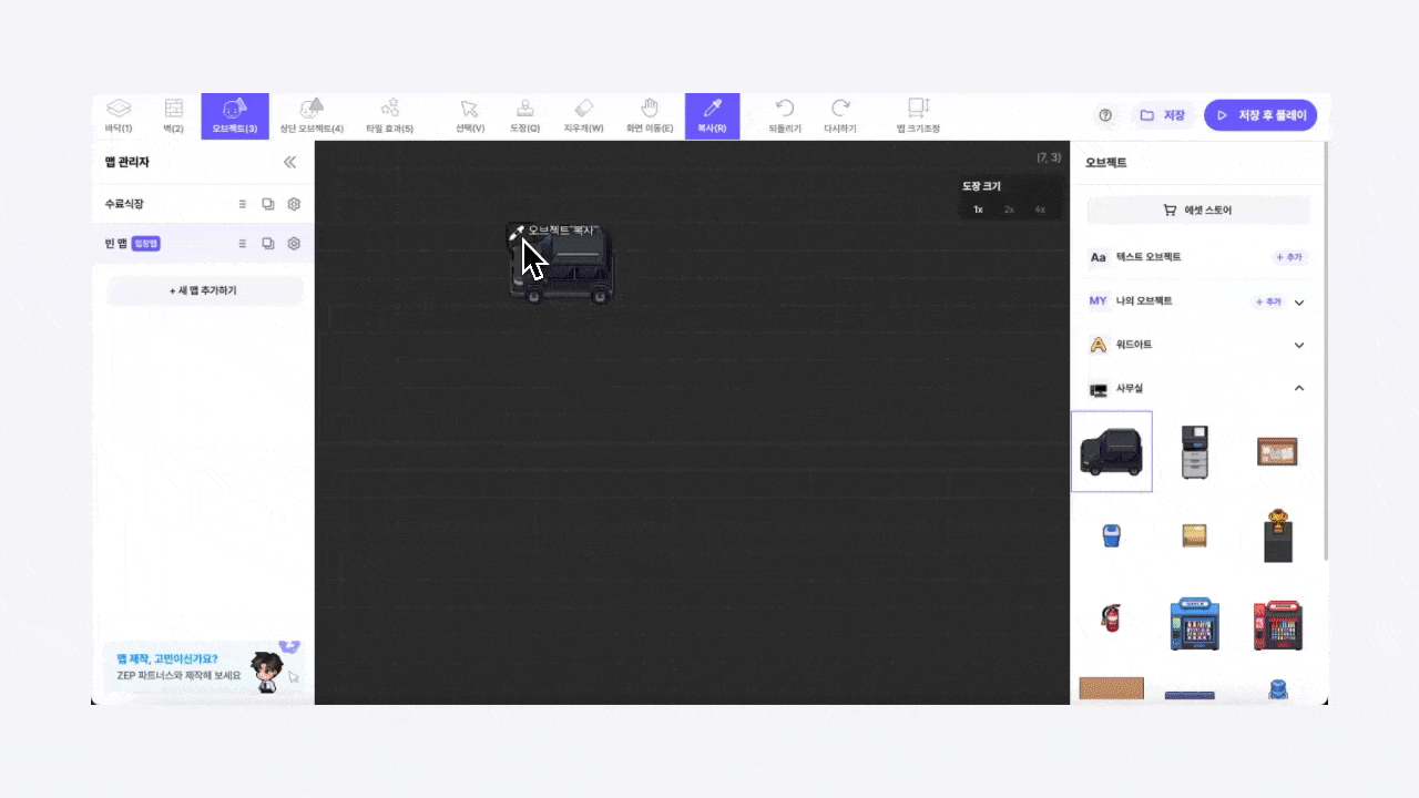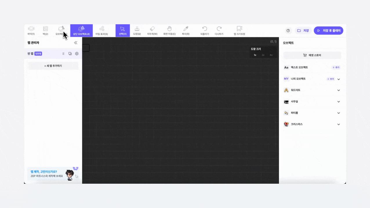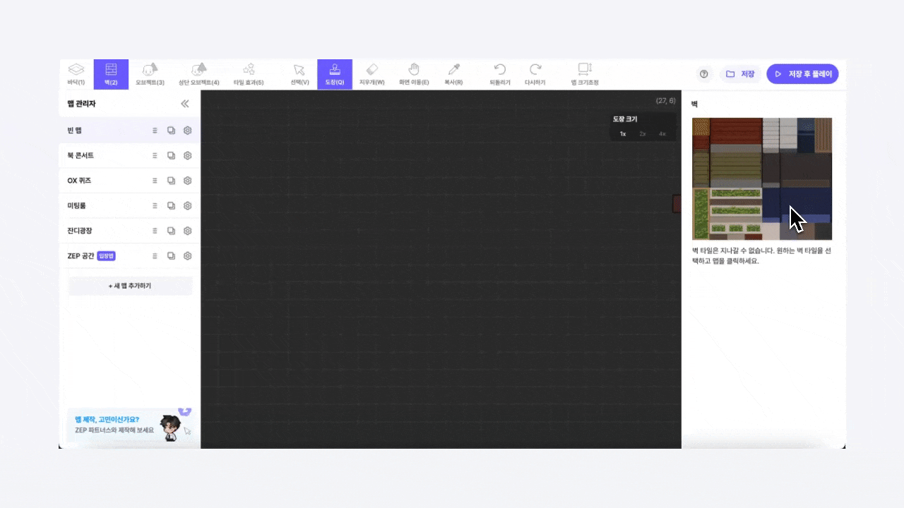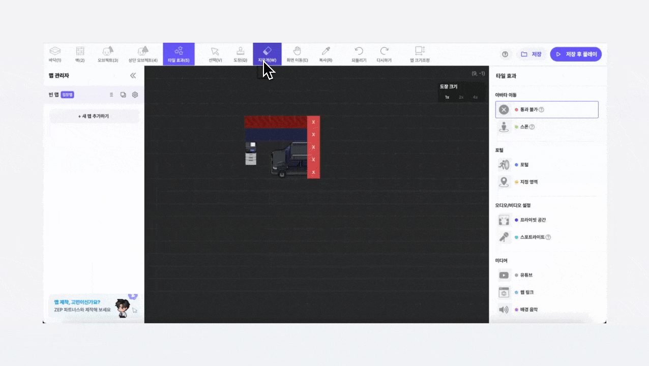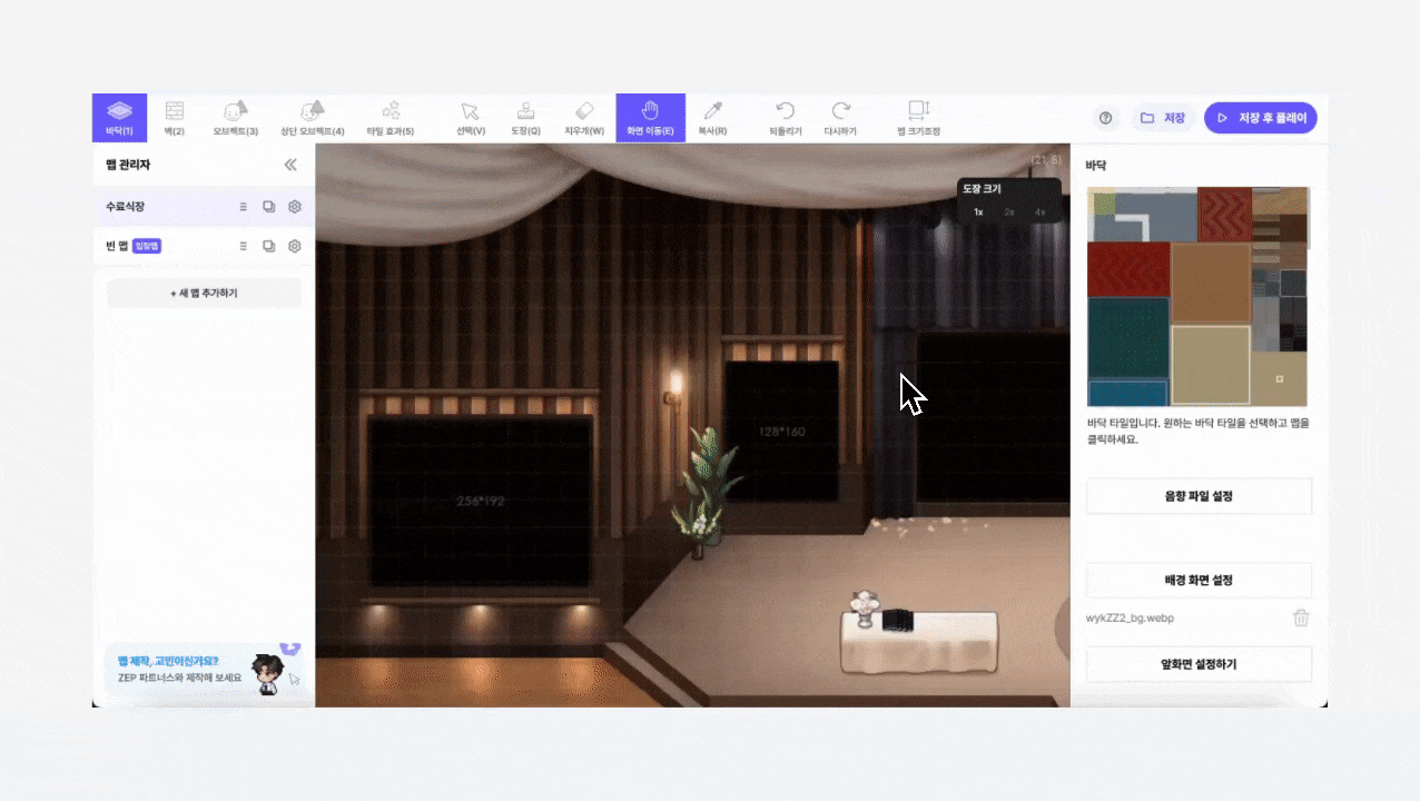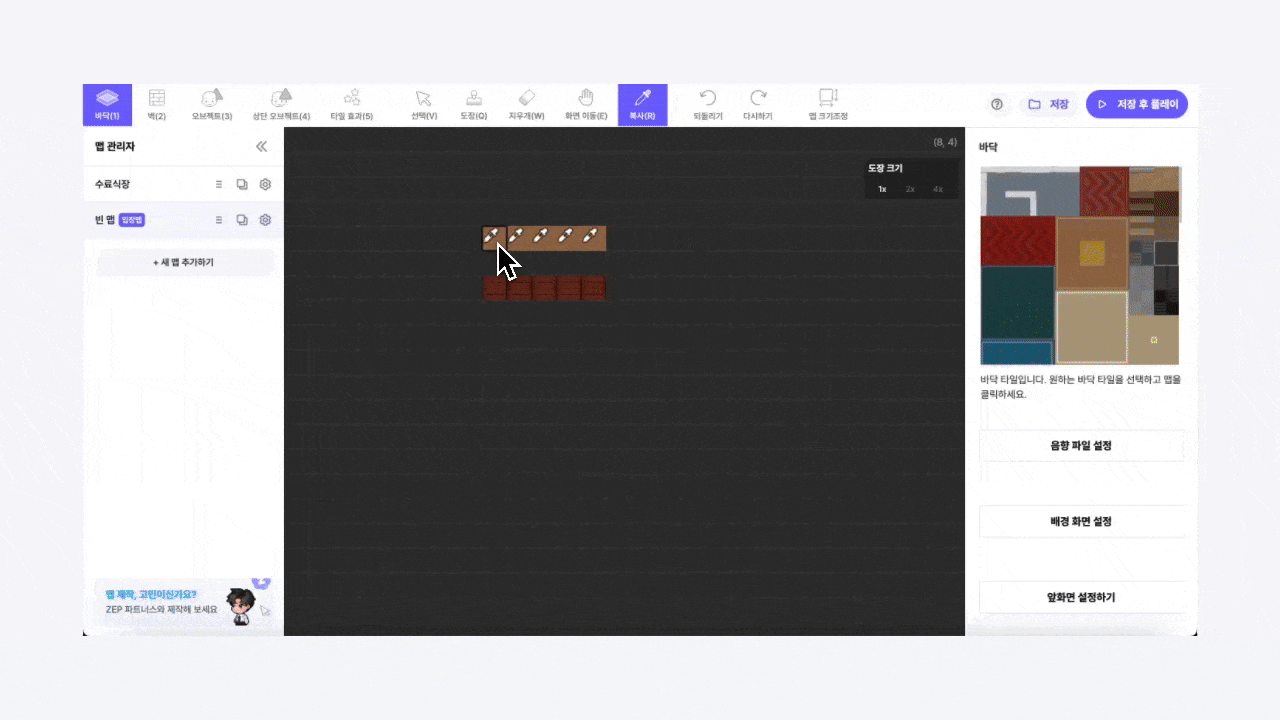 マップに壁、床、オブジェクト、タイル効果を設置できます。