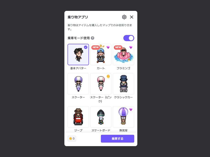 乗り物アプリを利用すると、アプリで提供されるさまざまな乗り物アイテムを使ってマップ内を移動できます。