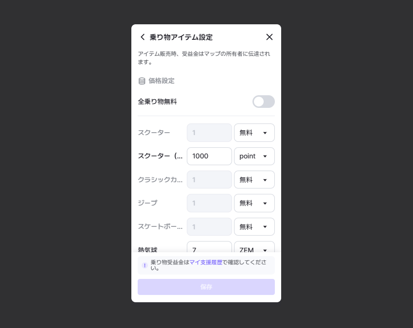 管理者は乗り物アプリアイテムの価格を「無料/非表示/ZEM/ポイント」に設定できます。