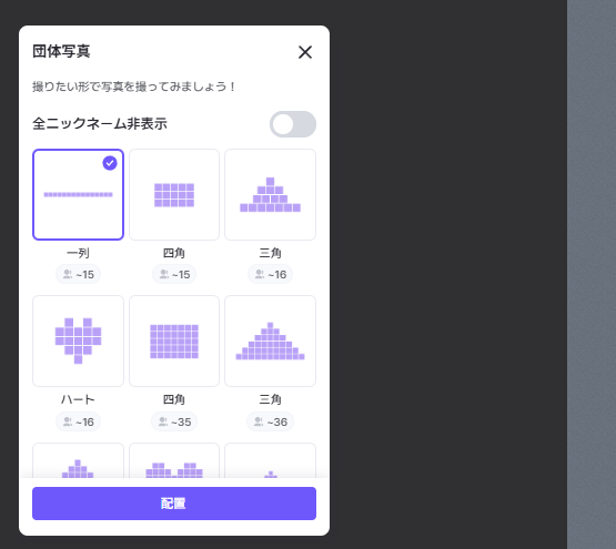 スペース内にユーザーを選択した形(三角、ハート、四角、ツリー)に配置できます。