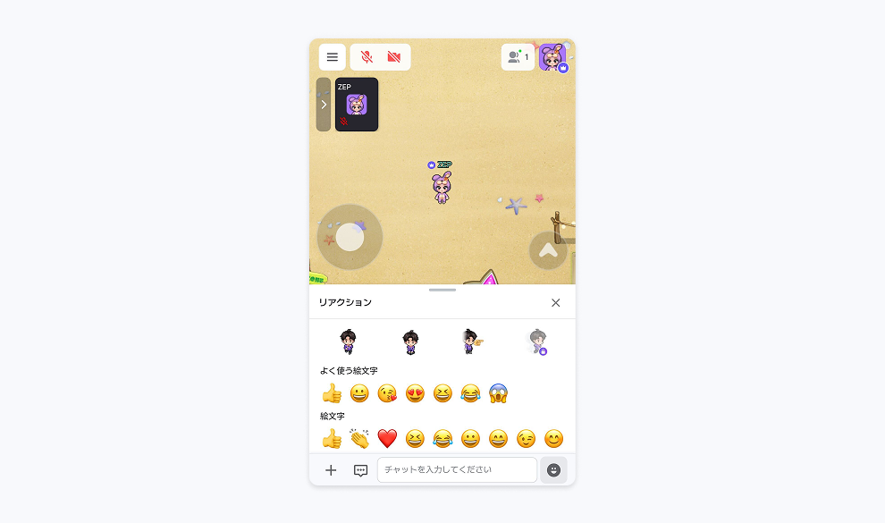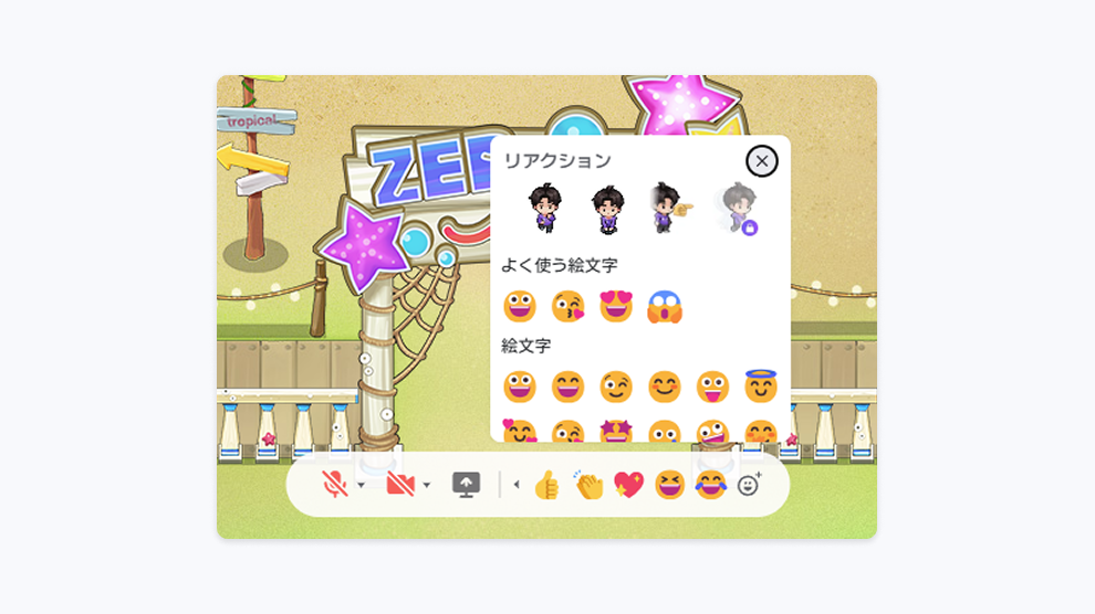 リアクションアイコンをクリックすると基本アイコンを使用することができ、[もっと見る]ボタンをクリックすると基本アクションとは異なる絵文字も自由に使用することができます。