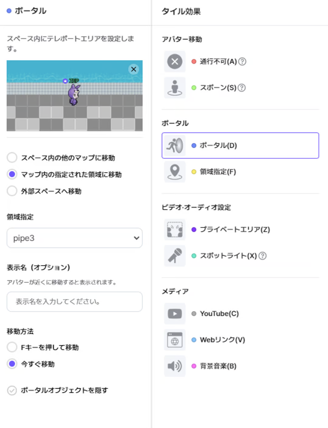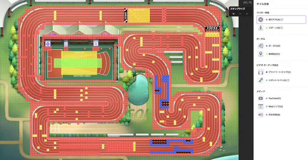 マップエディタ上段で[タイル効果]→[領域指定]を選択し、設定にあう領域を置きたい位置に設置してください。 全種類の領域が最小1つ以上設定されるとゲームが始まります。