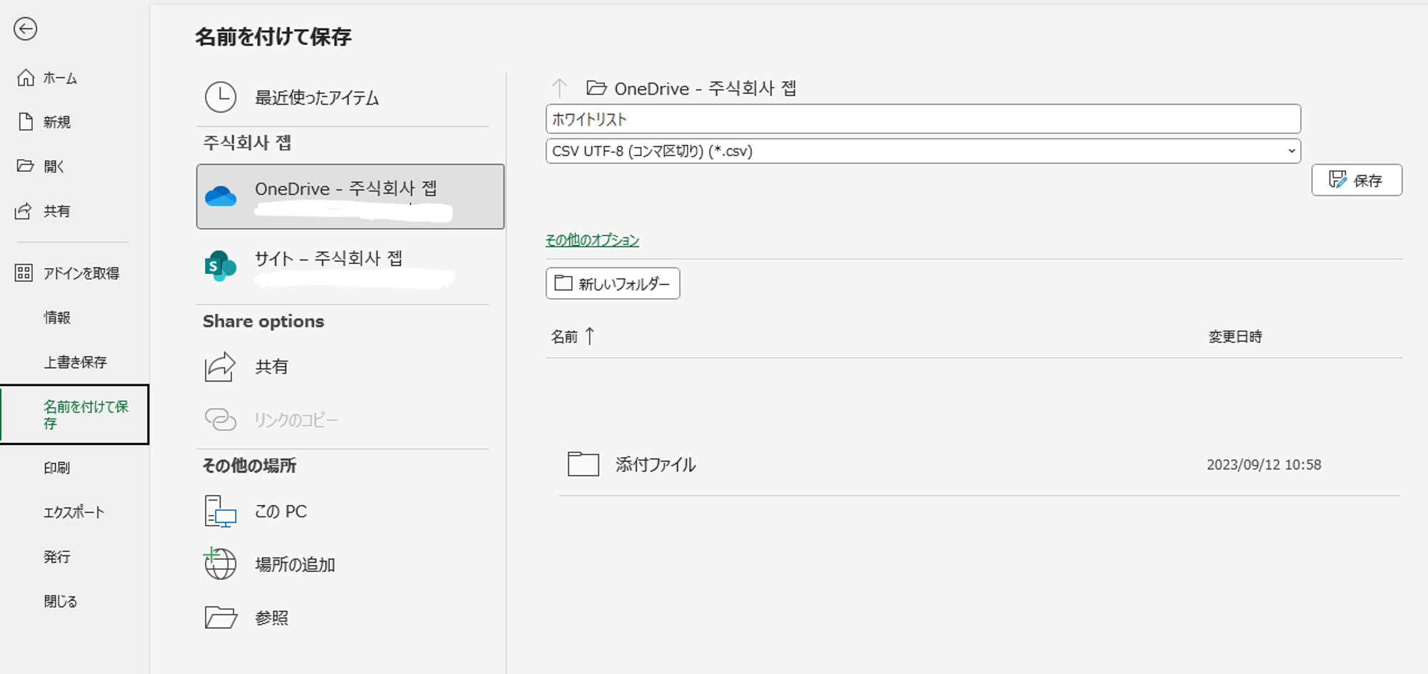 • 左上隅の[ファイル]→[名前を付けて保存]→ファイル形式:**CSV UTF-9(コンマ区切り)(*.csv)→[**保存]