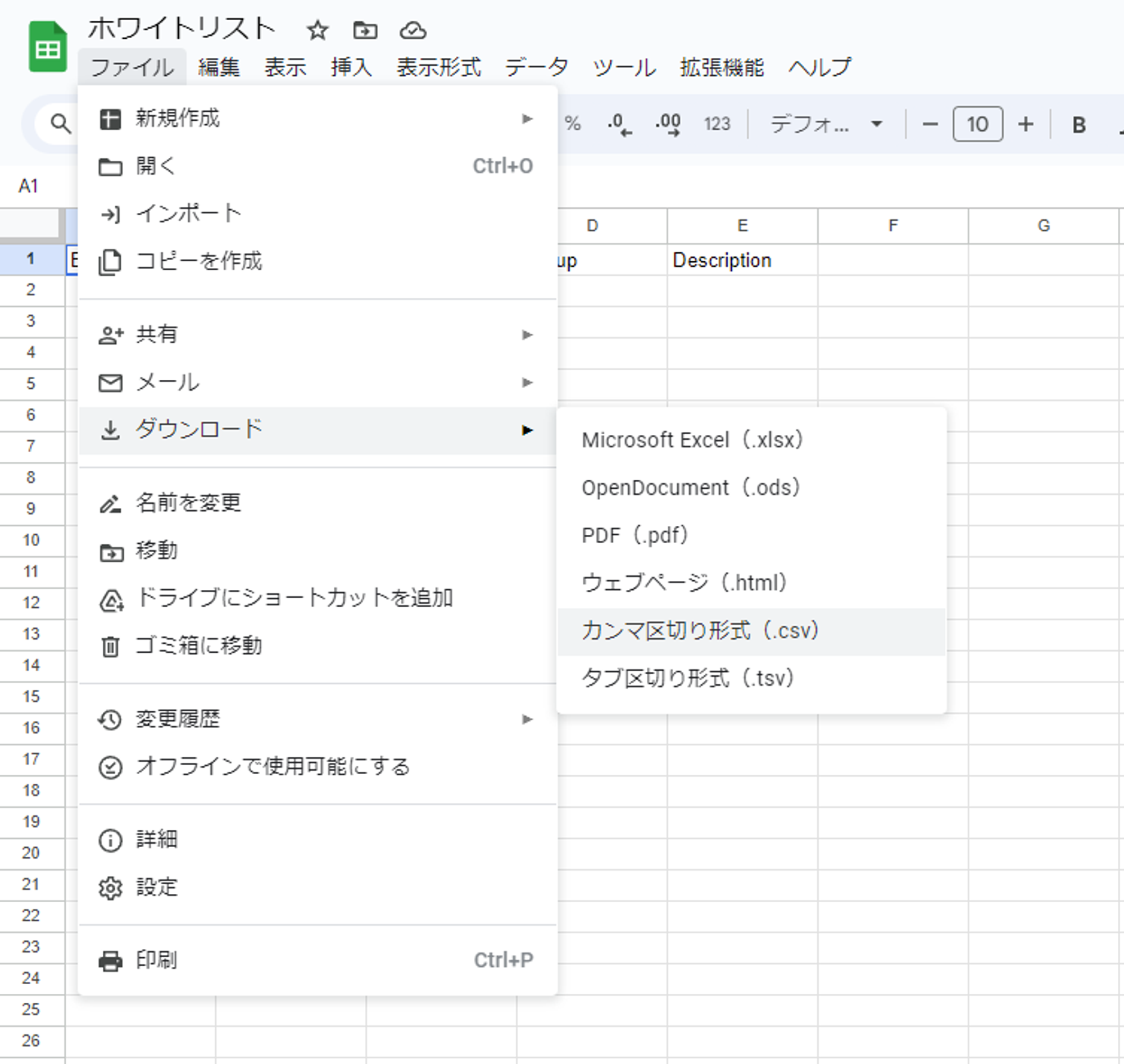 • 左上の[ファイル]→[ダウンロード]→[カンマ区切り形式(.csv)]クリック