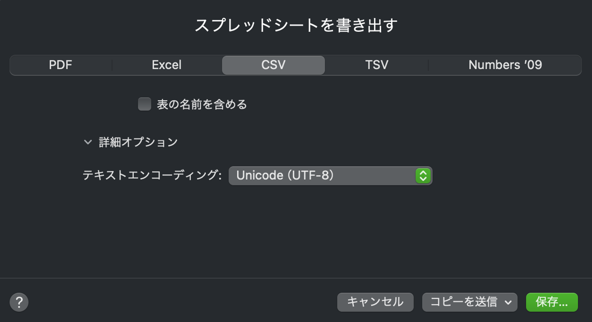 • [スプレッドシートを下記出す]→[詳細オプション]→[テキストエンコーディング:Unicode(UTF-8)]→[保存]