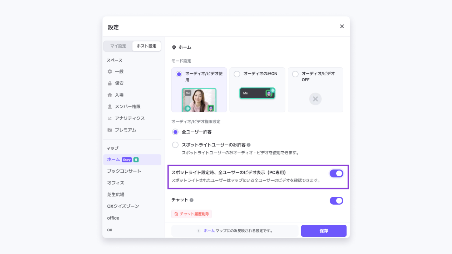 [設定]→[ポスト設定] → [マップ]→[スポットライト設定時、全ユーザーのビデオ表示(Web専用)])