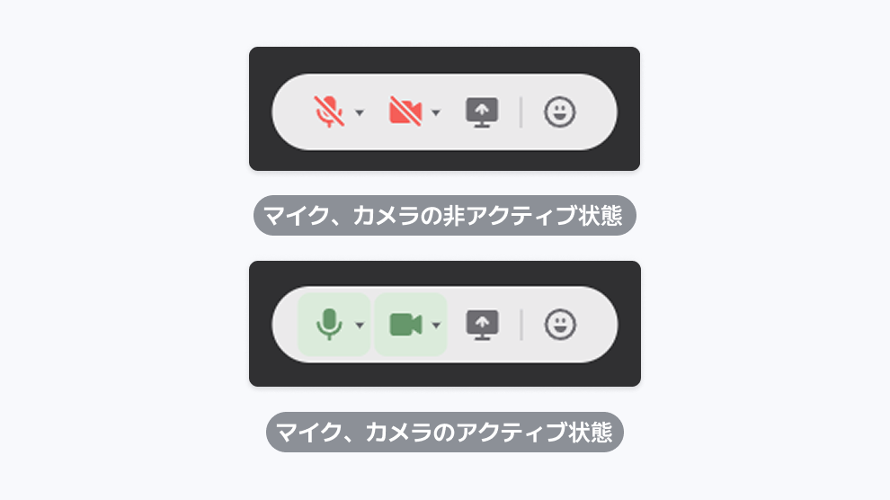 画面下段のマイク/カメラアイコンをクリックし、ON/OFF状態を変更できます。