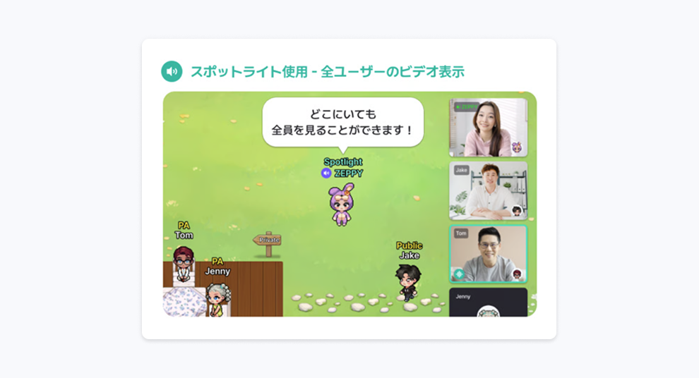スポットライト使用 | 同じマップにいるユーザーがスポットライト付のユーザーのオーディオ/ビデオを確認できます。 |