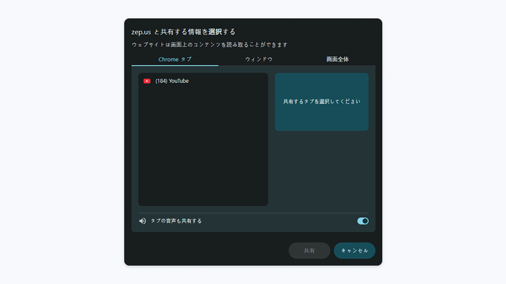 システムオーディオを共有したくない場合は、「タブオーディオ共有」「システムオーディオ共有」のチェックボックスをもう一度クリックして、無効化してください。