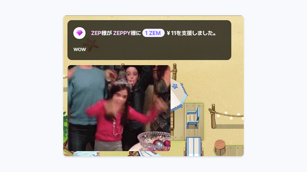 支援は動くイメージ(Giphy)とメッセージをスペースに表示することができ、支援の際に全ユーザーに表示されます。