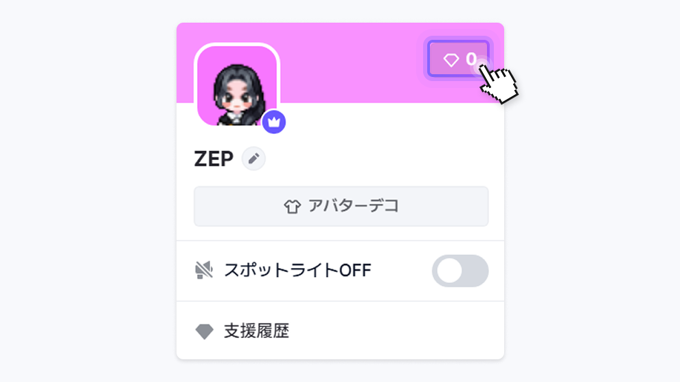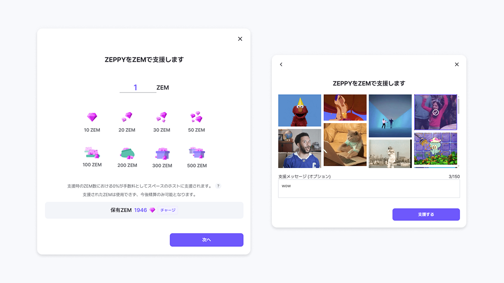 支援したいユーザーのアバターをクリックし、[支援する]ボタンを押すことでZEMを送信できます。