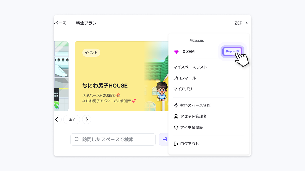 ZEMはPLAY画面内の[マイプロフィール]・公式ホームページ右側上段のニックネーム→[チャージ]ボタンをクリックし、チャージできます。