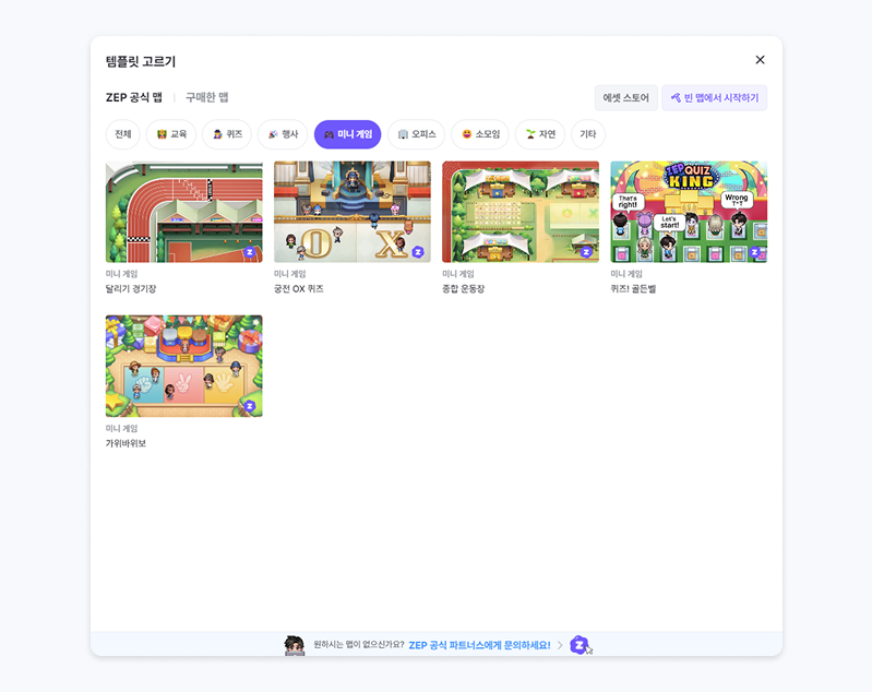 가위바위보 맵은 [스페이스 만들기 > ZEP 공식 맵 > 미니 게임 > 가위바위보]로 만들 수 있습니다.