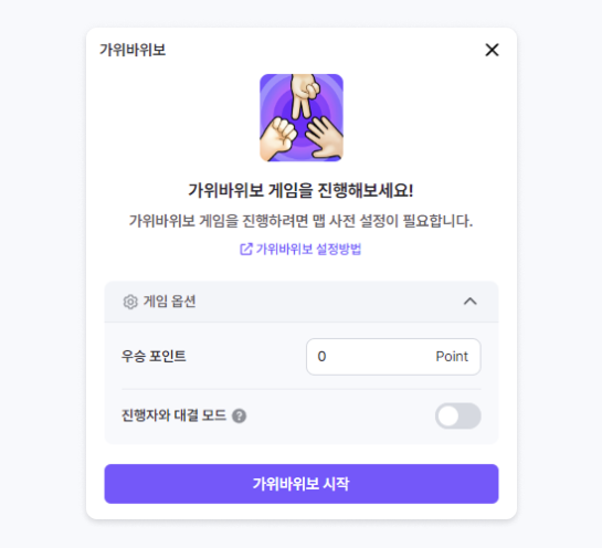 진행자가 사이드바 [미니 게임] > [가위바위보] 게임을 실행하면 게임이 시작됩니다.