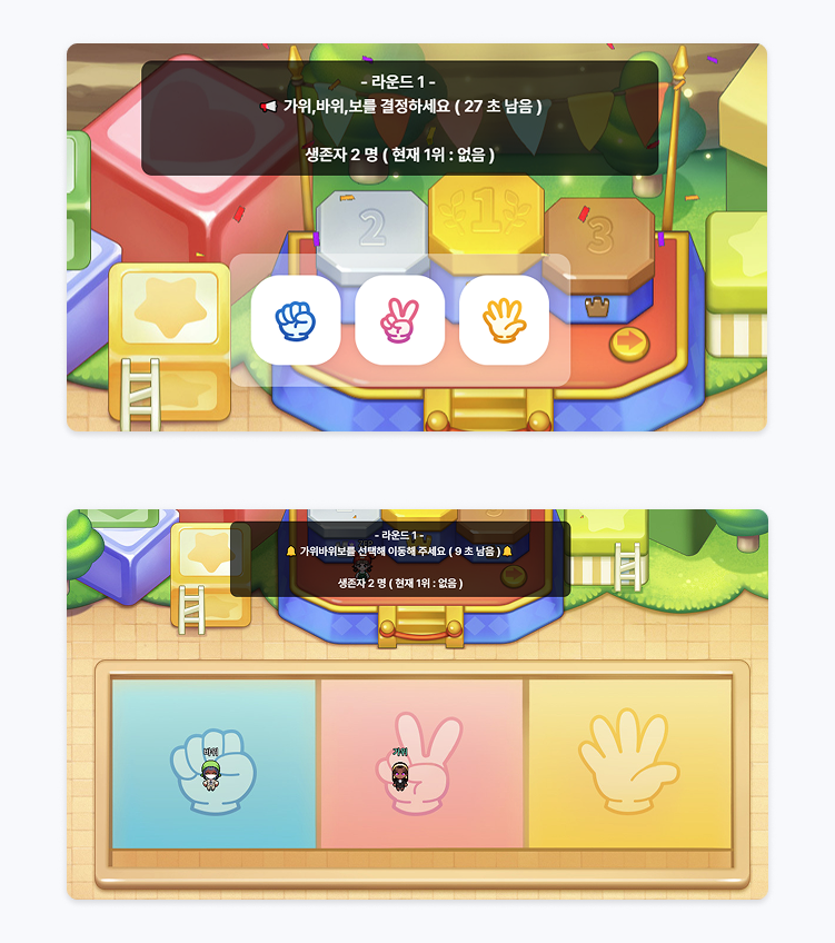 플레이어들은 20초 동안 진행자의 선택을 예측하여 가위, 바위, 보 지정 영역으로 이동합니다.