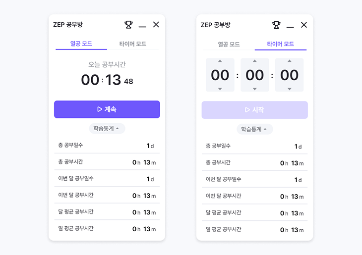 열공 모드와 타이머 모드가 있습니다.