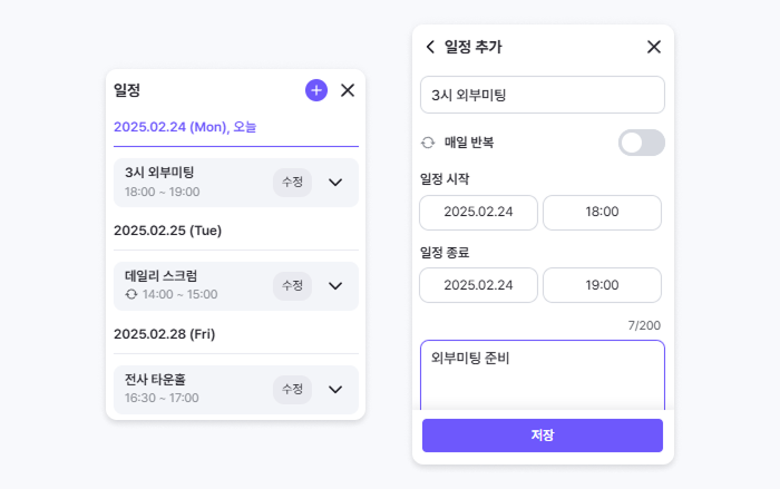 [반복 일정] 옵션을 활성화 하면 해당 일정이 매일 해당 시간에 반복됩니다.