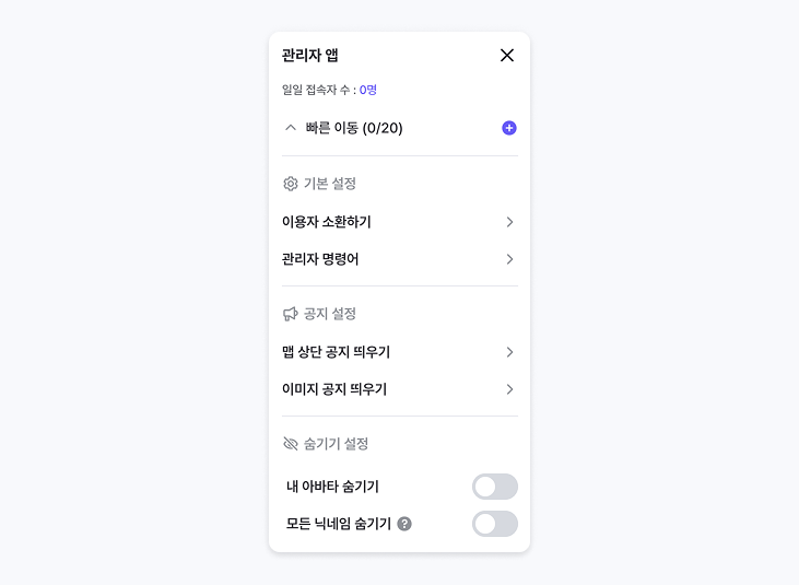 관리자는 자신의 아바타를 숨긴 채 맵을 돌아다닐 수 있습니다.