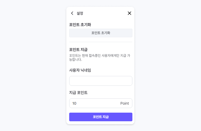 관리자는 포인트를 초기화 하거나 특정 사용자에게 포인트를 줄 수 있습니다.
